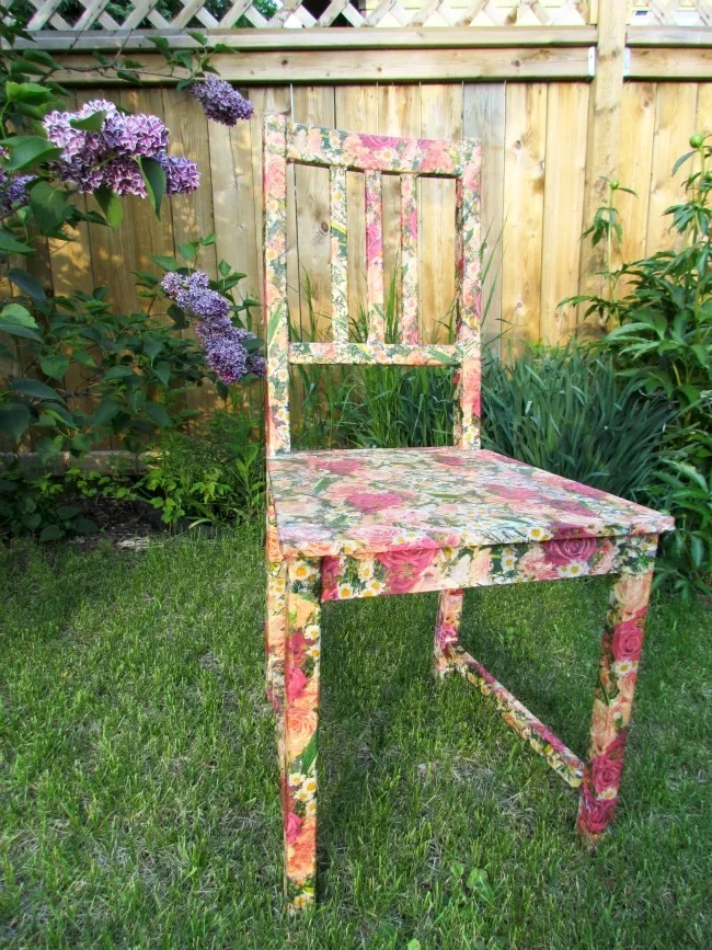 Cover a plain wood chair using some fancy pants napkins โ what a makeover! This decoupage furniture idea makes quite an impact.