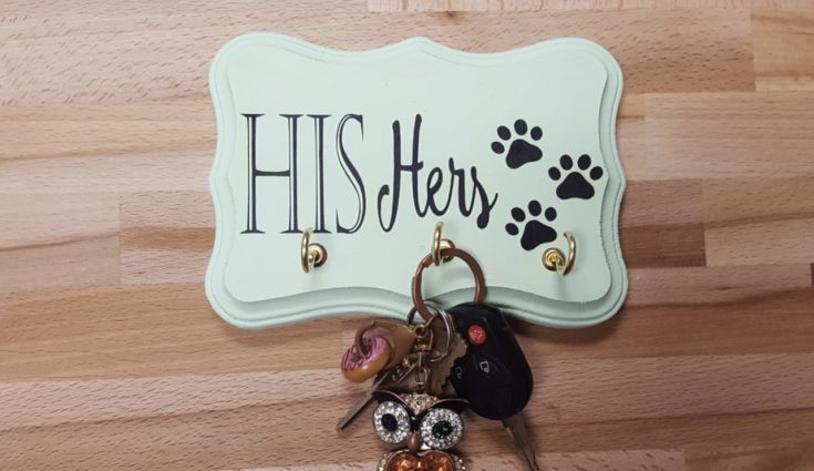 Apply vinyl to painted wood is really easy to do! I love that this key rack is for him, her, and a pup.